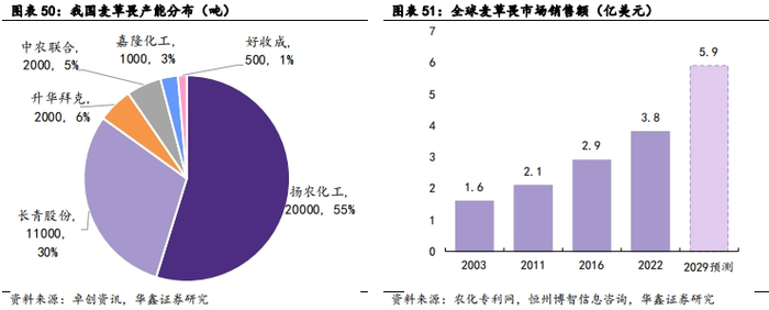 麦草畏是一种高效低毒,具有内吸传导作用的安息香酸系列除草剂,传统应用领域为禾本科作物,可以有效控制 90 多种一年生和两年生杂草,还可以抑制 100 种多年生阔叶杂草和木本植物的生长,主要用于小麦、玉米、水稻等,也用于非耕地除草。由于麦草畏生产具备较高的技术壁垒,原料供应厂商有限,行业新进入者较少,行业总体产能扩张有序,行业集中度较高。国外麦草畏产能主要集中在巴斯夫(8000吨)、GHARDA(1000吨)和先正达(2000吨)。我国共有3.65万吨麦草畏产能,主要以出口为主。其中公司是麦草畏全球龙头,拥有麦草畏产能2万吨,占比55%。
