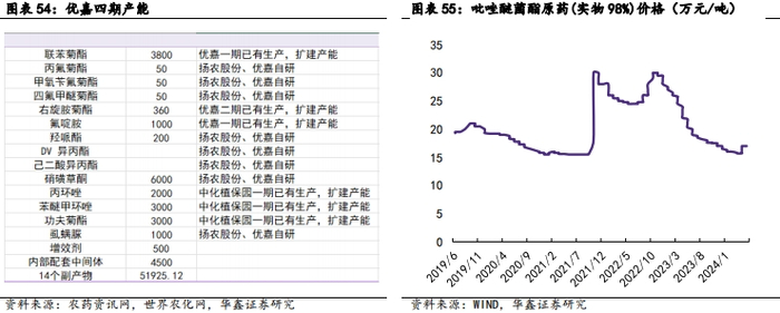 公司在产原药涉及杀虫剂、杀菌剂、除草剂、植物生长调节剂等约70 个品种,总产能超10万吨。公司菊酯类杀虫剂产能21535吨/年,其中卫生菊酯产能2600吨/年,在国内的市场占有率约为70%;农用菊酯产能18935吨/年,其中功夫菊酯和联苯菊酯产能在国内均居于首位,功夫菊酯产能5500吨/年,联苯菊酯产能4600吨/年。除草剂约6万吨(其中麦草畏2万吨,草甘膦3万吨),杀菌剂1万吨以上。公司优嘉四期二阶段项目于2023年11 月底完成调试,迅速达产达效,同步加快推进优嘉五期项目。葫芦岛一期一阶段项目2024年将调试投产,二阶段项目正快速跟进,葫芦岛项目投产运营,将进一步优化公司产品布局,形成新的效益增长点,为公司持续稳健发展奠定了坚实基础。