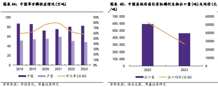 草甘膦行业集中度高,90%以上出口。2016年来,我国供给侧改革的推进加上严厉的环保督察行动,多家环保不达标、产能落后的中小草甘膦生产企业陆续关停退出,2023年我国草甘膦产能为78万吨,与2009年103万吨相比下滑了25万吨,行业集中度提高明显。草甘膦产能利用率整体持稳,2023年草甘膦产量48万吨,产能利用率约60%。我国是草甘膦生产第一大国,加上草甘膦的需求与转基因作物种植面积强相关,而目前转基因作物种植面积主要分布在美国、巴西、阿根廷、加拿大、印度等海外国家,因此国内草甘膦大量出口至海外市场,目前我国生产的草甘膦约90%以上用于出口。2023年我国其他非卤化有机磷衍生物出口量为46万吨,同比-22%;出口金额为124亿元人民币,同比-60%;出口均价为26794元/吨,同比-49%。