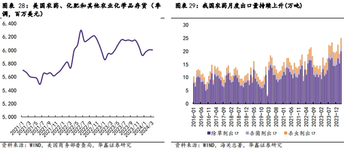 农药去库周期开启,行业有望迎来底部反转。美国2021年进口农药40.92万吨,是世界上第二大农药进口国(仅次于2021年进口农药44.55万吨的巴西),其农化库存在全球市场中具有代表性。2023年美国整体农化库存相比2022年有所下降, 2024年一季度美国经历一轮去库高峰后,库存爬升趋缓,未来有望逐步回归合理水平。此外,我国生产农药量中70%-80%为出口导向,2023年以来我国农药出口有所回升,2024年随着国际市场库存的逐步消化完成,预计下半年国际市场对中国农药的进口会持续增加。