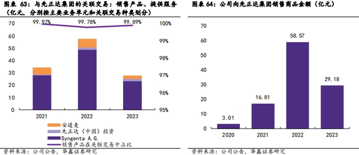 关联交易大幅增长,公司供应先正达原药优势显现。自2021年公司被先正达收购以来,公司和先正达集团的关联交易显著增长,业务往来更加密切。一方面,公司从先正达集团采购商品和获取劳务的业务规模稳步增长,持续获得先正达必要的产品和服务支持。另一方面,公司向先正达销售商品和提供服务的金额远高于采购商品和获取劳务的金额,主要原因在于公司向Syngenta A.G.(先正达瑞士)和安道麦销售了大量产品,其中2021-2023年公司向Syngenta A.G.销售产品的金额分别达到28.13/48.86/23.36亿元,向安道麦销售产品金额分别达到5.34/6.68/2.35亿元。