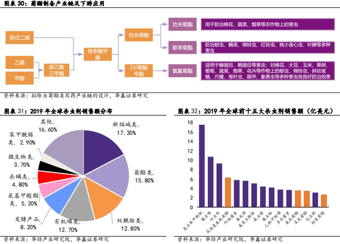 拟除虫菊酯为全球第二大杀虫剂产品,市场空间广阔。在全球食品安全和环保政策趋于严格的背景下,高效低毒的杀虫剂品种替代高毒性的杀虫剂品种将成为未来杀虫剂市场的发展趋势。杀虫剂种类繁多,目前最主要且广泛使用的杀虫剂包括新烟碱类杀虫剂、拟除虫菊酯类杀虫剂、双酰胺类杀虫剂和有机磷杀虫剂等。其中,拟除虫菊酯是一类模拟天然除虫菊酯化学结构合成的农药,为全球第二大杀虫剂产品,具有活性较高、药效迅速、杀虫谱广等特点,且持效期长、作用迅速、环境危害小。2019年全球销量前十五大杀虫剂中菊酯类产品中上榜4项,分别为高效氯氟氰菊酯、氯氰菊酯、溴氰菊酯以及联苯菊酯,占2019年全球杀虫剂销售额的比例约为17.9%。