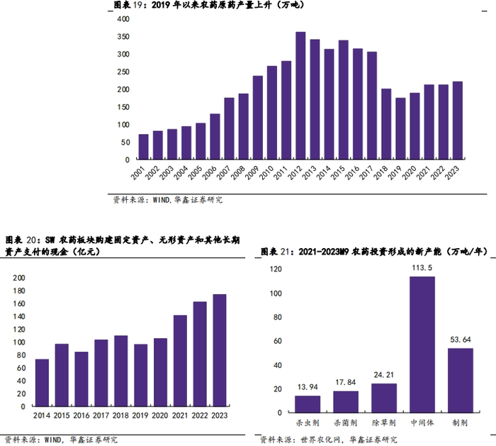 农药行业投资增加造成阶段性过剩。2014-2019年,我国通过土地、环保等政策措施严格控制资源浪费、“三废”排放量大、污染严重的农药新增产能,禁止能耗高、技术水平低、污染物处理难的农药产品的生产转移,加快落后产能淘汰。期间我国农药原药产量下滑,这是我国农药行业追求高质量发展的结果。2020年以来,随着满足复产条件企业数量的增加和新产能逐步释放,农药整体供应好转。2021-2022年,受疫情影响,农药企业开工率不足,农药供有限,叠加上游原材料涨价,最终农药价格大幅上涨带动农药市场进入高景气阶段。2023年以来,随着新冠疫情管控终结,市场预期经济强劲反弹,农药行业投资再次兴起,农药产品进入新一轮产能扩张,热点产品规划投建产能持续增长。根据世界农化网,2021-2023前三季度国内农药行业新增产能杀虫剂13.94万吨/年、杀菌剂17.84万吨/年、除草剂24.21万吨/年、中间体113.5万吨/年以及制剂53.64万吨/年。投资最热品种包括除草剂草铵膦(精草铵膦)、烯草酮;杀虫剂氯虫苯甲酰胺、啶虫脒和联苯菊酯;杀菌剂丙硫菌唑、吡唑醚菌酯。规模化产能集中释放导致阶段性供给过剩,企业竞争激烈。