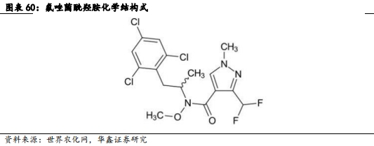 氟唑菌酰羟胺:为广谱杀菌剂,用于防治小麦赤霉病、油菜菌核病等,用途广泛,是同类杀菌剂中增长最快、潜力最大的产品之一。该产品目前已在全球50多个国家和地区登记上市,登记作物100多种。是新一代琥珀酸脱氢酶抑制剂(SDHI)类杀菌剂中的重磅产品,由先正达历时10年、耗资3.5亿美元、筛选9105个化合物后发现,该产品于2017年在阿根廷上市,2020年登陆中国市场。2021年氟唑菌酰羟胺全球销售额达3亿美元,先正达预计其年峰值销售额将突破10亿美元。
