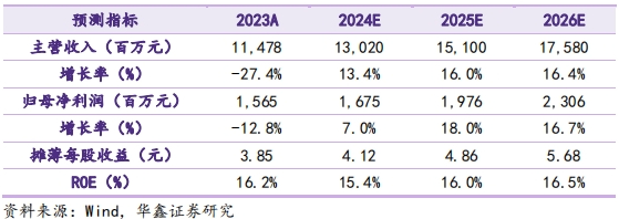 成本控制出色,毛利率维持中高水平。公司作为行业龙头,主营产品一体化程度高,降本增效成效显著。从生产降耗、能源节支、维修与辅材费管理做好多点挖潜,2019-2023公司期间费用率由13.20%降至9.63%。2023年公司销售费用率为2%,同比-0.19pcts;管理费用率为4.5%,同比-0.82pcts;研发费用率为3.64%,同比+0.49pcts。