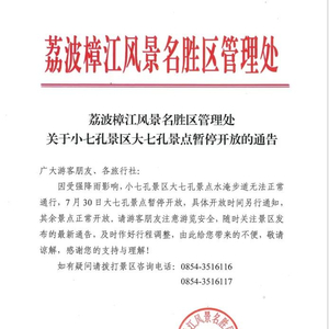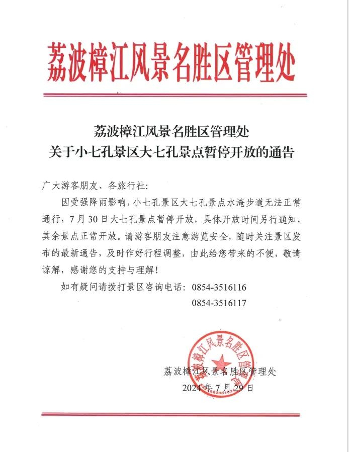 因受强降雨影响,小七孔景区大七孔景点水淹步道无法正常通行,7月30日大七孔景点暂停开放,具体开放时间另行通知,其余景点正常开放。请游客朋友注意游览安全,随时关注景区发布的最新通告,及时作好行程调整,由此给您带来的不便,敬请谅解,感谢您的支持与理解!