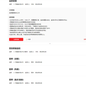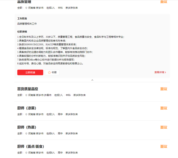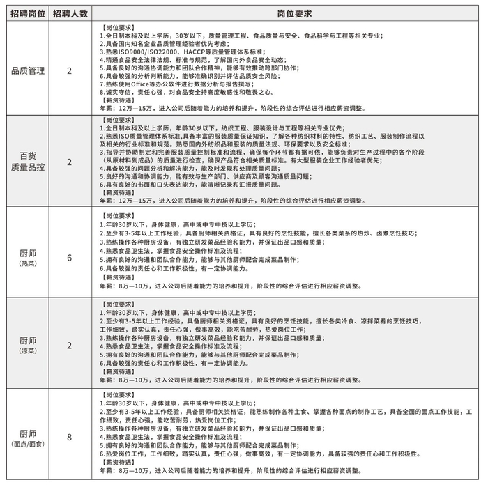 其中,品质管理、百货质量品控等岗位要求本科及以上学历,最高年薪为15万元。厨师岗位年薪最低8万元,薪资待遇会随着阶段性的综合评估进行相应薪资调整。