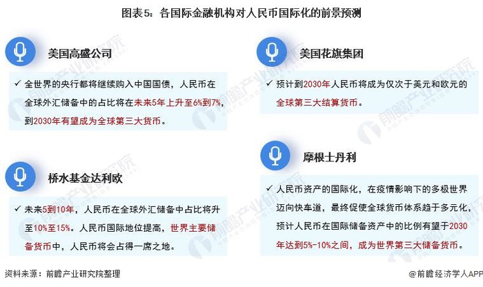 关于人民币国际化的发展前景,高盛、花旗、摩根士丹利三大投行均认为人民币有望在2030年成为世界第三大货币,高盛预计未来5年人民币在全球外汇储备中的占比将上升至6%-7%,摩根士丹利预计到2030年占比将达到5%-10%;与此同时,全球最大对冲基金桥水基金创始人达利欧也对人民币国际化前景也非常看好。前瞻认为,人民币自由兑换推进的背景下,人民币国际化推进充分抓住众多历史机遇,晋级世界第三大货币指日可待。