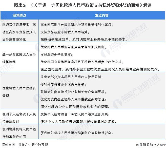 2021年1月发布的《关于进一步优化跨境人民币政策 支持稳外贸稳外资的通知》提出,从贸易投资人民币结算、跨境人民币结算流程、跨境人民币投融资管理、个人经常项下人民币跨境收付、境外机构人民币银行结算账户五个方面对跨境人民币政策进行优化,围绕实体经济需求推动跨境人民币使用便利化发展。