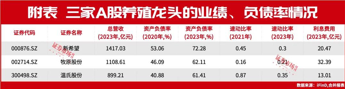 生猪养殖业是较为典型的重资产行业,过去几年养猪企业负债扩张,带来一定的财务压力。iFinD显示,新希望过去几年资产负债率上升较快,从2020年的53%上升至2023年的72.3%;牧原股份、温氏股份去年的资产负债率也分别达到62%、61.4%。
