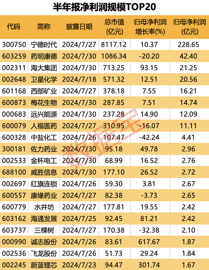 据证券时报·数据宝统计,截至7月29日,A股市场共计50家上市公司发布了2024年半年报。从净利润规模看,宁德时代(300750)暂居首位,为228.65亿元;药明康德排在次席,为42.4亿元;海大集团和卫星化学净利润规模也在20亿元以上。