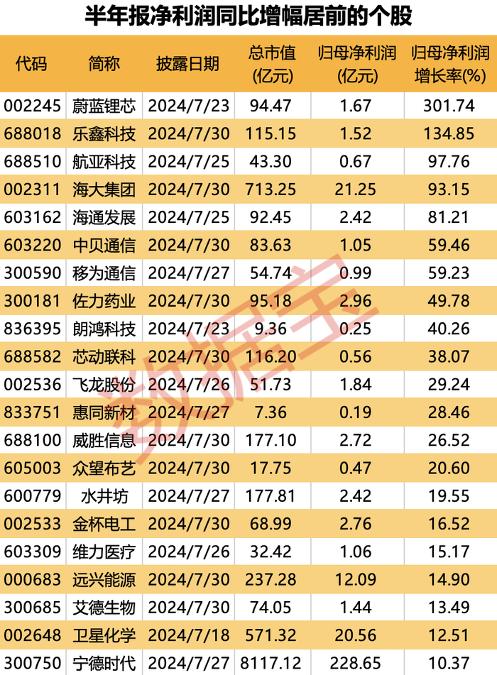 从净利润同比增幅来看,蔚蓝锂芯、乐鑫科技(688018)净利润翻倍,同比增幅依次为301.74%、134.85%;航亚科技和海大集团净利润增速均超过90%。