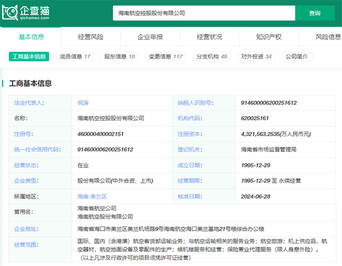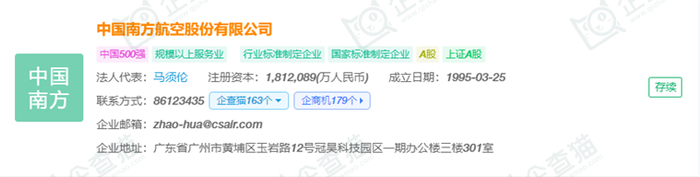 根据企查猫数据,中国南方航空股份有限公司成立于1995年03月25日,注册地位于广东省广州市黄埔区玉岩路12号冠昊科技园区一期办公楼三楼301室,法定代表人为马须伦。