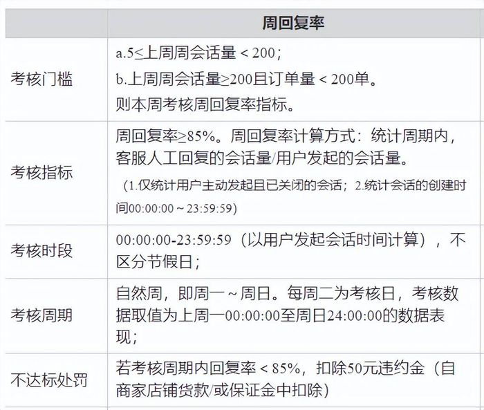 一种针对周订单量小于 200 单的小商家的回复率考核。他们不用做到 3 分钟内回复,只要每周保证起码回复买家 85% 的会话消息。如果没完成,会罚款 50。