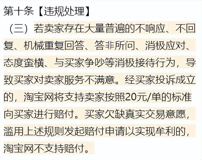 简单地说,以前只有店铺存在大量普遍的不响应、不回复的情况,在买家投诉之后,商家得按照每单 20 元的标准,向买家赔付。