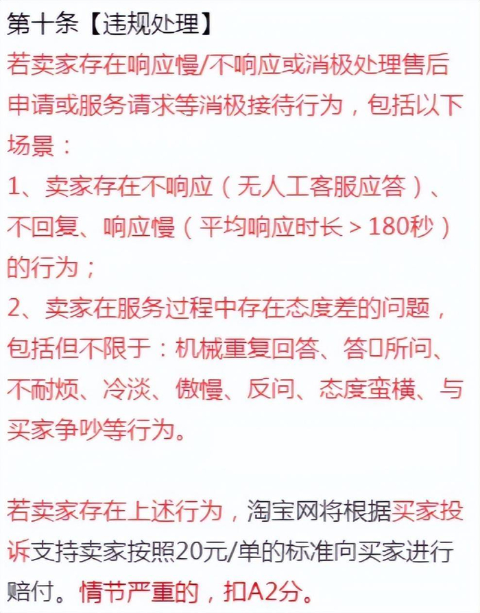但现在,每天 8 点到 23 点期间,如果客服在线,却没有在 3 分钟之内回复买家的消息。一旦买家投诉,卖家就有可能需要赔偿对方 20 元。