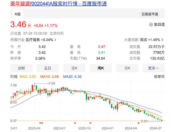 2021年之后,美年健康股票一直处于震荡下行的状态中。从过去一年的情况来看,2023年7月28日,美年健康收盘价是每股7.19元,今年7月26日的收盘价是每股3.46元,一年时间股价跌了超过一半。