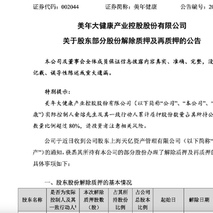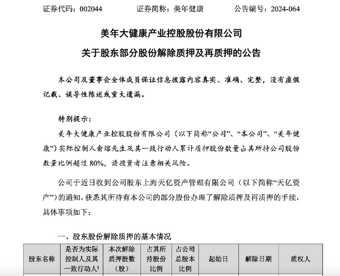 公告中同时做出特别提示,称美年健康的实际控制人俞熔及其一致行动人(包括天亿资产、上海维途企业发展中心、上海天亿实业控股集团有限公司、世纪长河科技集团有限公司等)累计质押股份数量占其所持美年健康股份数量比例超过80%,请投资者注意相关风险。