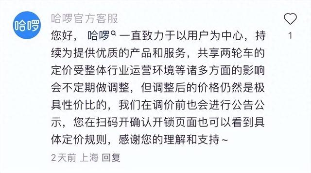 对此,哈啰官方客服回应表示,共享两轮车的定价受整体行业运营环境等诸多方面的影响会不定期做调整,但调整后的价格仍然是极具性价比的,哈啰在调价前会进行公告公示,用户在扫码确认开锁页面也可以看到具体定价规则。