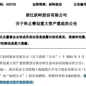 7月29日晚,跃岭股份公告称,公司此前拟以现金方式收购上海源悦汽车电子股份有限公司(简称“源悦汽车”)51%股权,现公司决定终止本次筹划重大资产重组事项。