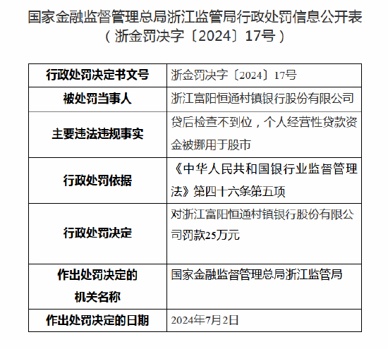 浙江富阳恒通村镇银行被罚25万元:因个人经营性贷款资金被挪用于股市 金融一线 2024.07.3011:55 关注 7月30日金融一线消息,国家金融监督管理总局浙江监管局行政处罚信息公开表显示,浙江富阳恒通村镇银行股份有限公司因贷后检查不到位、个人经营性贷款资金被挪用于股市,被罚款25万元。