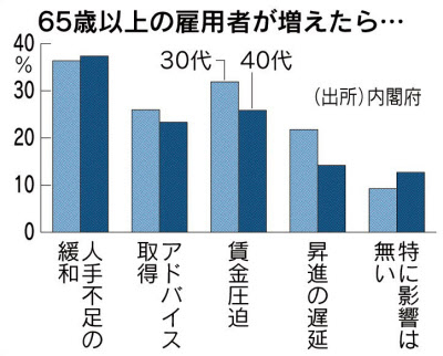 从上面的问卷调查可以看出,倒逼问题是确实存在的。日本政府要求各企业努力雇佣未满70岁的低龄老人,而容易获得企业雇佣的往往是那些拥有丰富工作经验、适合坐办公室的岗位,类似会计、人事、市场公关等。而日本又存在着空降文化,曾经在大公司工作过的人物可以凭借人脉等进入一些中小企业的管理岗并一直工作到70岁甚至更老,这严重挤占了年轻人的就业和升职空间。