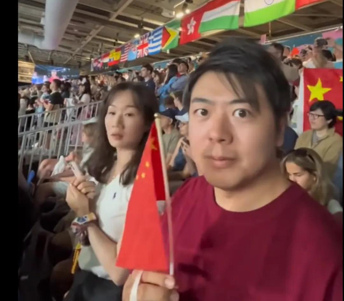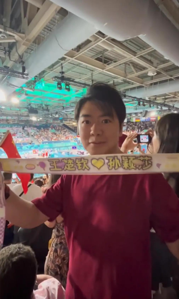 郎朗现身奥运赛场,观看孙颖莎和王楚钦的比赛。视频中他举着应援的手幅,为运动员们加油。