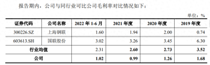 对此,欧冶云商解释称:主要系受报告期内公司业务调整的影响。自2018年以来,公司大力发展互联网交易业务,其中主要为统购分销业务,其业务规模迅速扩张,报告期内营业收入占比分别为77.68%、80.74%、81.33%和69.28%,毛利率分别为0.71%、0.55%、0.56%和0.61%,整体毛利率水平较低,因此随着该业务的迅速扩张导致公司综合毛利率的提升存在一定压力。