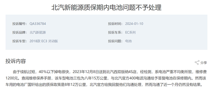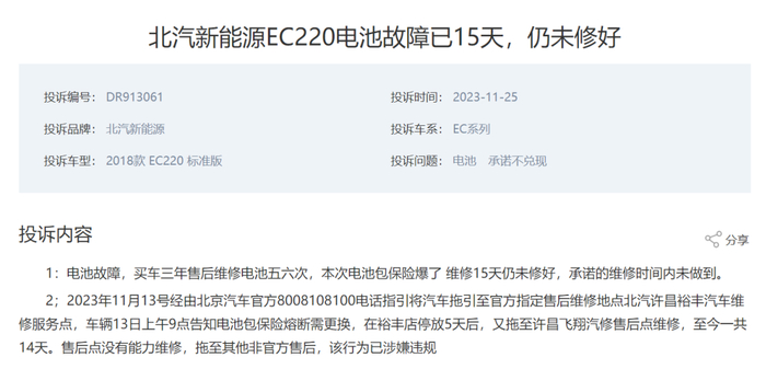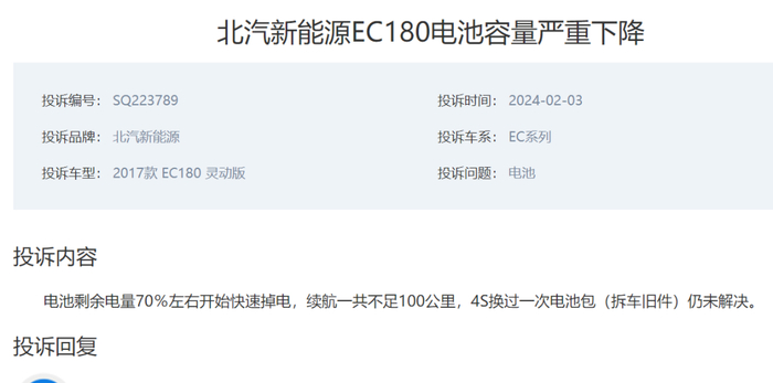 其中,多名车主投诉内容显示,北汽新能源电池在70%后掉电严重,40%之后迅速掉电,有车主在提新车仅两个月时间,就因电池包问题,短期内多次维修,与8年15万公里的三包承诺相差甚远。