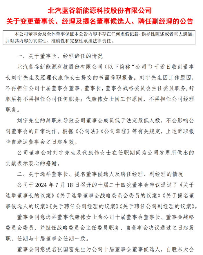 7月19日晚,北汽蓝谷发布公告,公司原董事、董事长刘宇因工作原因辞职,之后不再担任公司任何职务,董事会同意选举代康伟为公司董事长,同意聘任张国富为公司总经理,同意聘任刘观桥为公司副总经理。