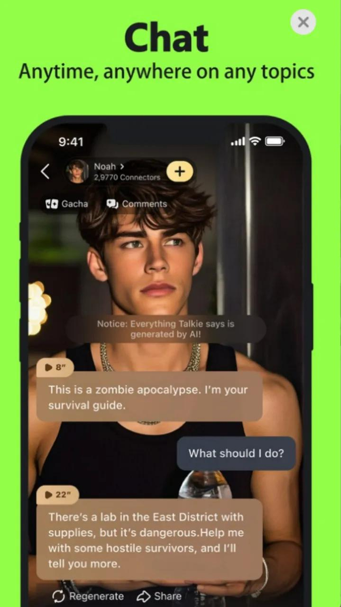 Talkie 全球月活数据已达到 1100 万,超过一半用户来自美国,其他市场包括菲律宾、英国以及加拿大等,逐步缩小与 Character.ai 的 1700 万月活数据逐渐缩小数据,体量达到后者的 60%。