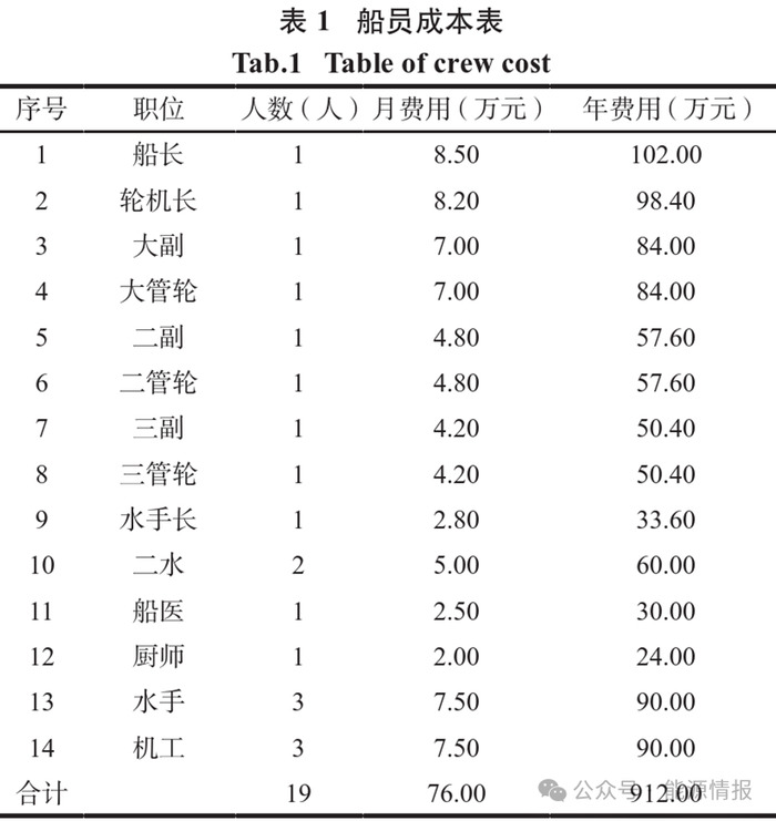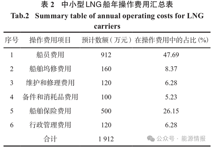 船员费用是指为了满足船舶营运需求配置一定数量的船员而支付的费用,按照目前市场价格,一艘中小型LNG船每年的船员费用约为912万元,包含船员工资、航行津贴、伙食补贴、倒班费、保险费、证书培训等;单船船员成本如表1所示。