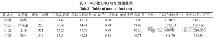 燃油费用是指船舶在其营运期间所消耗的燃油费用(不包括LNG蒸发气成本),由船舶主机在各种工况下的燃料消耗费用构成,包括船舶航行、进出港、靠离泊、装卸货和停泊时消耗的燃油。据调研,国内某中小型LNG船在国内各航线上的单航次燃油成本和年度燃油费用如表3所示。
