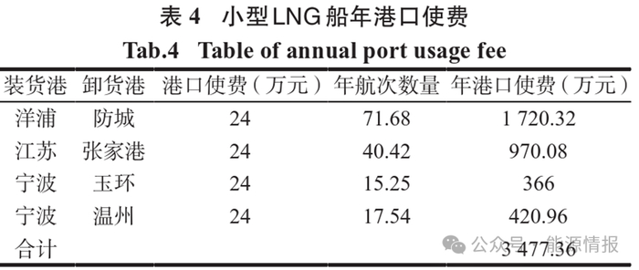 港口使费是指船舶每完成一个航次在装卸货2个港口所发生的费用,主要包括拖轮费、引航费、代理费、港务费、系解揽费、航养费等,不同的港口收费不尽相同,中小型LNG船港口使费约为24万元/航次,如表4所示。