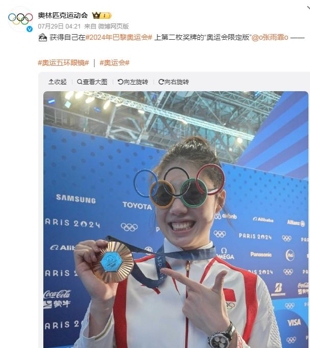 泳坛名将张雨霏在游泳女子100米蝶泳决赛夺得铜牌后,手持奖牌并佩戴五环眼镜自信大笑。有报道称,这一画面展现了她的乐观态度,以及对比赛结果的坦然接受。
