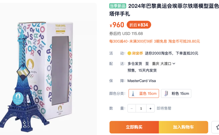 在巴黎奥运会开幕前,一款渐变色的埃菲尔铁塔模型(渐变色铁塔)就成为爆款产品。据了解,这款渐变色铁塔模型分为15厘米和31厘米两款。在二手网站,这款渐变铁塔已经被炒到将近千元。