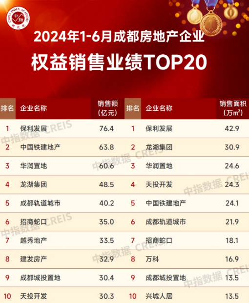 2024年,全国新房市场整体延续调整态势,成都上半年商品住宅销售面积664万㎡,位于全国第一,市场韧劲仍在。企业格局持续洗牌,央国企仍为市场主力。2024年上半年,保利发展以1733亿元位列全国房企销售业绩首位,保利四川公司也以权益销售金额约76.4亿元,荣获成都权益销售额TOP1,表现突出。