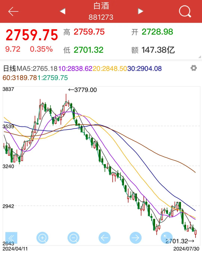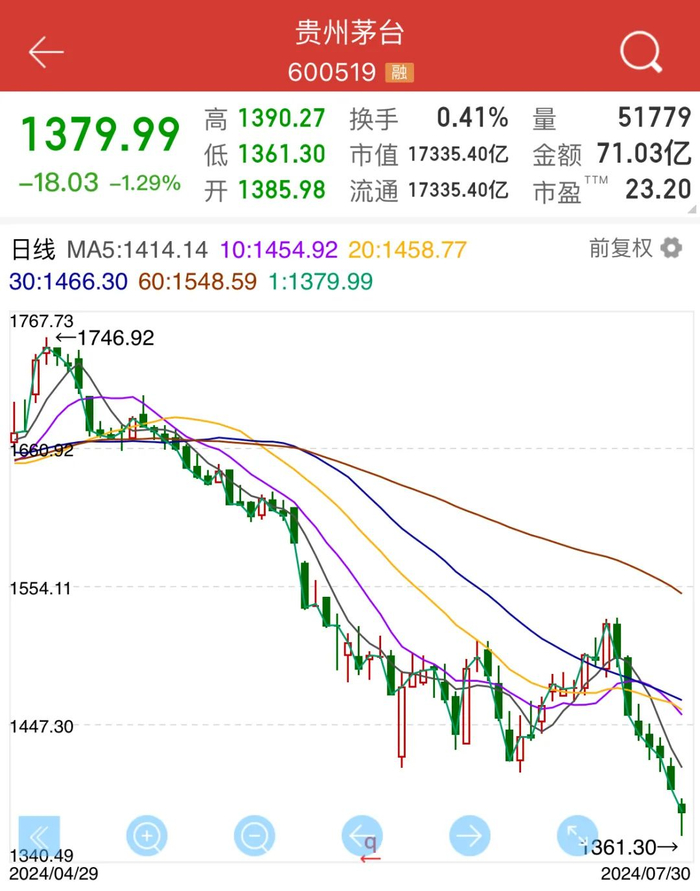 最近白酒连续下挫,真的有点顶不住了。今天贵州茅台盘中跌超2%,刷新年内新低。截至今天收盘,贵州茅台收报1379.99元,跌1.29%。