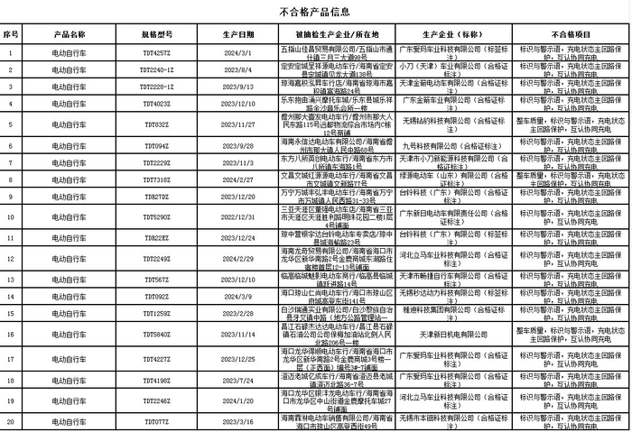 南海网7月30日消息(记者 蒙健)近日,海南省市场监督管理局公布了2024年电动自行车整车及其充电电池质量专项监督抽查结果公告。记者了解到,本次抽查覆盖全省18个市县,共检出20批次产品质量不符合相关标准,均为电动自行车产品,不合格项目主要为标识与警示语、充电状态主回路保护、互认协同充电、整车质量等。不合格产品标称生产企业涉及广东、天津、江苏、河北、山东等5个省市。