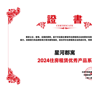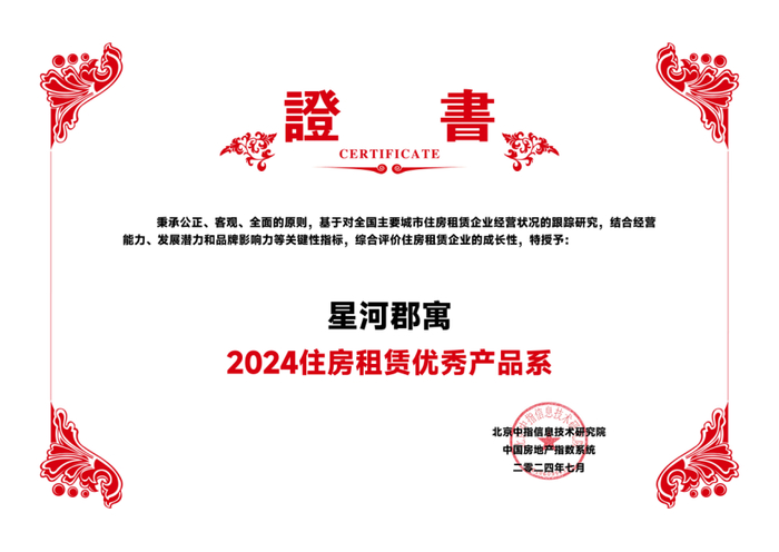 2024年7月4日,由北京中指信息技术研究院主办,中国房地产指数系统、中国物业服务指数系统承办的“中房指数2024房地产市场趋势报告会”在北京召开。会议发布了中国住房租赁优秀企业及项目研究成果,星河产业集团旗下精品公寓品牌“星河郡寓”凭借优越的表现,荣膺“2024住房租赁优秀产品系”认证。
