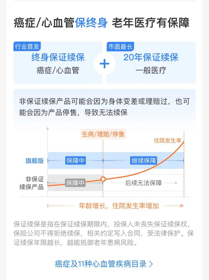 在这个基础上,再对癌症和11种心血管病保证续保终身。