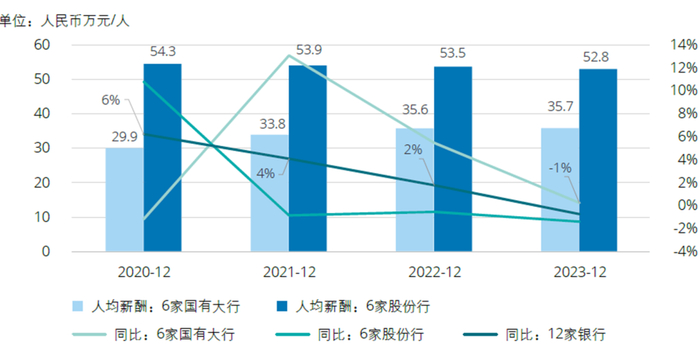 整体来看,6家股份行人均薪酬均值显著高于6家国有大行,但随着6家国有大行人均薪酬均值的正向增长和6家股份行人均薪酬增值的负向增长,差异由2020年的21.2万元/人缩小为2023年的17.1万元/人。