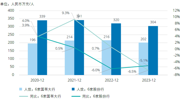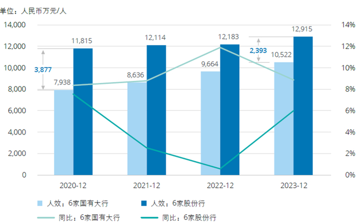 2020年-2023年,6家国有大行人均资产规模均值持续低于6家股份行。但6家国有大行各阶段同比增速高于6家股份行,且增速差异逐步扩大,人均资产规模差异由2020年末3,877万元/人缩减为2023年末2,393万元/人。