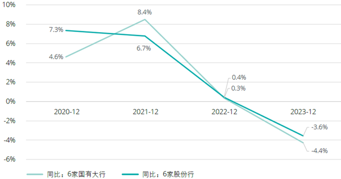 6家国有大行营业收入同比变化呈现先上升后下降的趋势,自2021年末增速达到峰值8.4%后逐步下降,并在2023年末出现负增长,即-4.4%。而6家股份行营业收入同比整体呈下降趋势,但在负向增长后其变化略缓于6家国有大行。