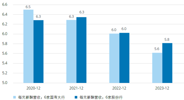 薪酬资源效能指每元薪酬成本所创造的价值,以每元薪酬创造的营业收入或净利润衡量。12家银行每元薪酬营收均值整体呈下降趋势,2023年6家国有大行和6家股份行每元薪酬营收均值分别相较于2020年下降0.9和0.5。