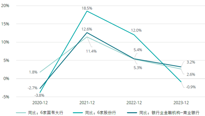 2021年末商业银行净利润同比增速至高点后趋缓。2023年末,商业银行合计实现净利润达2.4万亿元,同比增长3.2%,但2023年末6家国有大行和6家股份行的净利润同比增速均低于商业银行整体水平。其中,6家国有大行净利润同比增速变化较大,由2022年末的12%降至2023年的-0.9%。