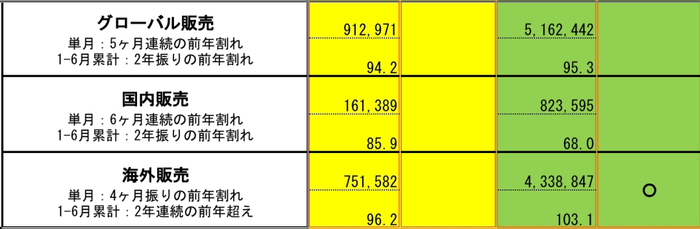 7月30日,丰田汽车公司公布6月全球产销情况。数据显示,6月丰田汽车全球销量912,971辆,同比下滑5.8%,其中日本本土市场销量161,389辆,同比下滑14.1%,海外市场销量751,582辆,同比下滑3.8%。截至6月,2024年丰田汽车全球销量为5,162,442辆,同比下滑4.7%,其中日本本土市场下滑32.0%,海外市场同比增长3.1%。