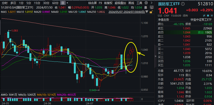 今日国防军工板块继续逆市活跃,反映板块整体行情的国防军工ETF(512810)早盘探底回升,午后回落翻绿,尾盘翘尾收涨,日线斩获三连阳!全天振幅达2.31%,成交额连续3日在5000万元上方。
