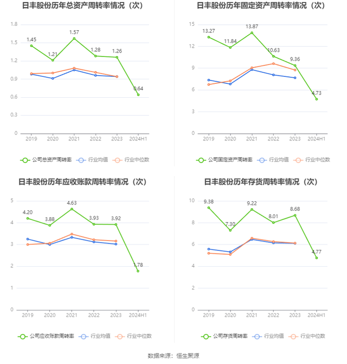 营运能力方面,2024年上半年,公司公司总资产周转率为0.64次,上年同期为0.68次(2023年上半年行业平均值为0.45次,公司位居同行业8/36);固定资产周转率为4.73次,上年同期为5.68次(2023年上半年行业平均值为3.89次,公司位居同行业9/36);公司应收账款周转率、存货周转率分别为1.78次、4.77次。