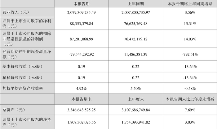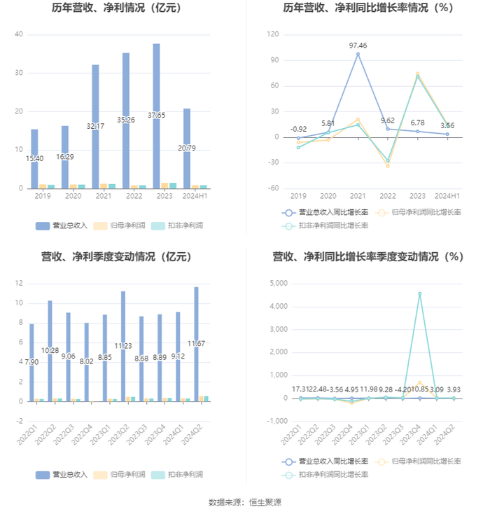 根据半年报,公司第二季度实现营业总收入11.67亿元,同比增长3.93%,环比增长27.97%;归母净利润5528.43万元,同比增长15.82%,环比增长67.18%;扣非净利润5565.16万元,同比增长12.76%,环比增长76.40%。